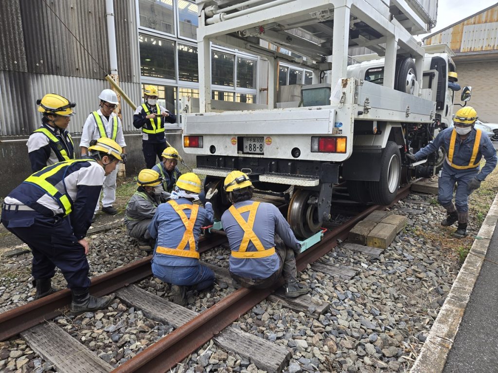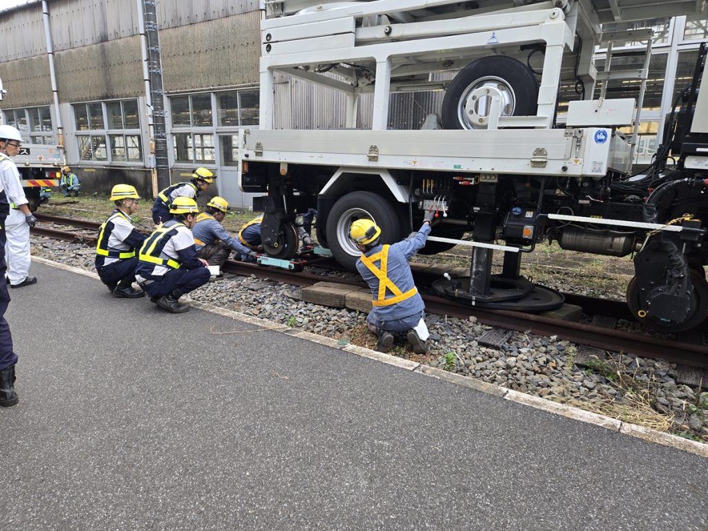 2025.10.24 お知らせ 25年10月23・24日外部訓練 軌陸車脱線復旧訓練 軌陸車の脱線が発生 枕木を敷き車の操作にて鉄輪を線路に合わせる 搬送台車に乗せ復旧完了 前の記事 お知らせ一覧に戻る 次の記事