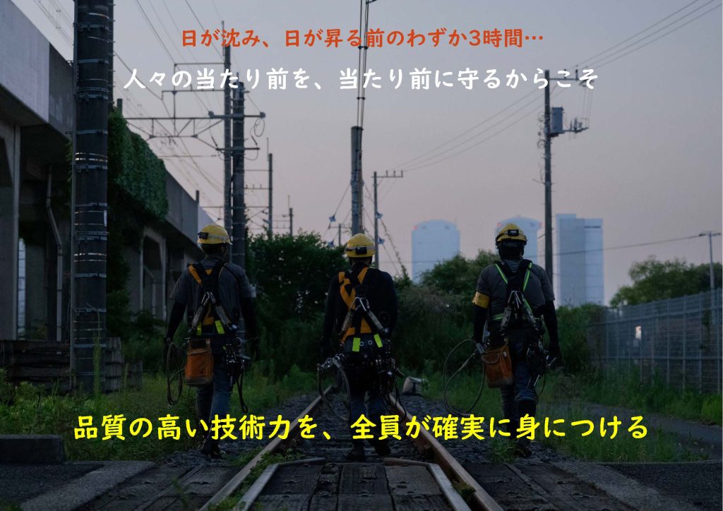 深夜の線路内。ミリ単位の調整に妥協は一切なし。「これでいいか」ではなく「これが正解だ」と言えるまで、先輩の目は鋭く光る。この厳しさは、お客様と仲間の命を守るための誇り。