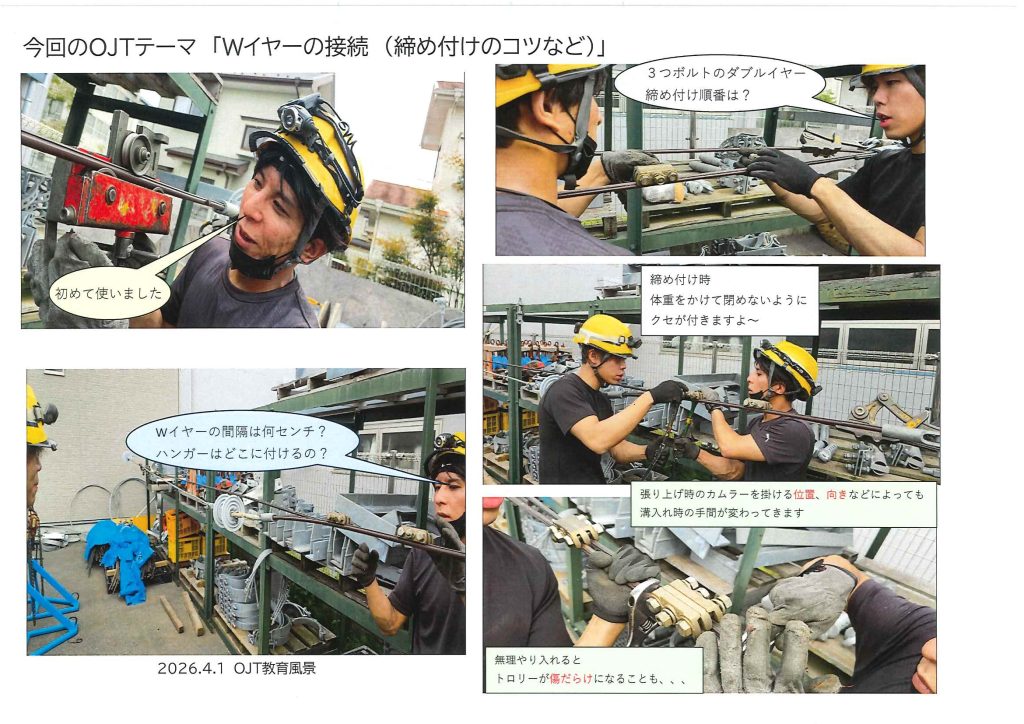 トロリ線(摩耗に強い硬銅線など)の接続、特に「W(ダブル)イヤー」を用いた接続作業は、列車の集電性能に直結する非常に重要な工程です。